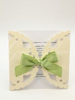 Свадебные приглашения Gilliann Emily INV037 Легкое и воздушное приглашение в спокойных тонах. Простой и в то же время очень привлекательный дизайн приглашения делает его практически универсальным для различных свадебных стилей, особенно для свадьбы с стиле прованс и летней свадьбы на свежем воздухе. Пригласительное Gilliann Emily изготовлено из дизайнерского картона кремового цвета. Обложка украшена вырубными рисунками и аккуратным бантиком из атласной ленты оливкового цвета. Страничка с текстом пригласительного письма размещается внутри. Прочитать письмо можно вытянув страничку. Также получатель сможет развязать бантик и раскрыть створки обложки. Материал: дизайнерский картон, атласная лента. Размер: 14 х 14 см Мин. заказ 500 руб.