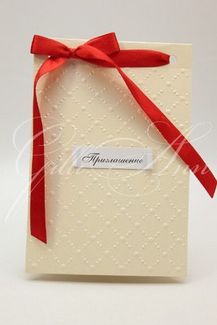 Свадебные приглашения Gilliann Ivory INV007 Свадебные приглашения сделано из дизайнерского картона цвета айвори. Тиснение создает объемный рельефный геометрический рисунок. Приглашение сделано из двух частей, соединенный ярко-красной атласной, завязанной в бант в верхнем левом углу. Вся информация для гостя размещена внутри. Материал: дизайнерский картон, атласные ленты. Размеры: любые. Мин. заказ 500 руб.