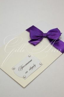 Свадебные пригласительные Gilliann Isabella INV016 Свадебное приглашение в форме конверта из дизайнерской бумаги цвета айвори. С правого края конверт обтянут фиолетовой атласной лентой, завязанной в бант. В левой части - бирка с надписью и четырьмя жемчужинами в фигурных углах. Текст с приглашением для гостя написан на листке белой бумаги, который вкладывается внутрь. Материал: дизайнерская бумага, атласная лента, жемчуг Размеры: любые. Мин. заказ 500 руб.