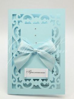 Свадебные пригласительные со стразами Сваровски Gilliann Charm INV034 Изысканное пригласительное на свадьбу в форме книжки. Изготовлено из дизайнерского картона приятного голубого оттенка. Обложка украшена вырубным рисунком в виде резной рамочки, декорирована пышным бантом из голубой атласной ленты и стразами Сваровски. Надпись "Приглашение" размещена на крошечном раскрытом свитке. Страничка с текстом приглашения располагается внутри. Рассылка приглашений - очень важная часть предсвадебной подготовки. Красивая открытка, дополненная продуманным письмом, покажет, насколько важно для Вас присутствие каждого гостя. Материал: дизайнерский картон, атласная лента, стразы Сваровски. Размер: 12 х 18 см Мин. заказ 500 руб.
