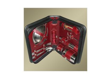 Набор дорожный подарочный "Доброго пути-4" 1.Сумочка-барсетка из искусственной кожи с внутренней отделкой из натуральной кожи 1шт. 2.Фонарик светодиодный 1шт. 3.Рюмки из стального сплава, серебрение 2шт. 4.Зажигалка газовая 1шт. 5.Штопор - сомелье 1шт. 6.Карты игральные 1шт. 7.Ножницы маникюрные 1шт None