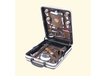 Набор подарочный «Атташе» (Набор для пикника) Комплектация:1. Кейс пластиковый с внутренней отделкой из натур. кожи и росписью ручной работы 1шт.2. Фляжка из нержавеющей стали 0,5 л 1шт.3. Вилки из нержавеющей стали 4шт. None