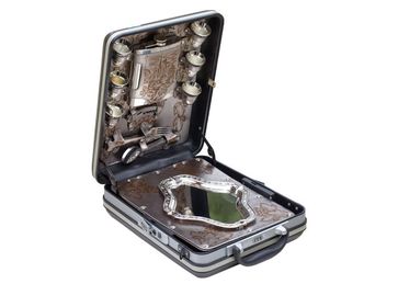 Набор подарочный «Оригинал» в серо-голубом оформлении (Набор для пикника) Комплектация:1. Кейс вертикальной компоновки с внутренней отделкой из натуральной кожи стойкой к загрязнениям, росписью ручной работы и откидным столиком 1шт.2. Фляжка из нержавеющей стали, отделанная натурал None