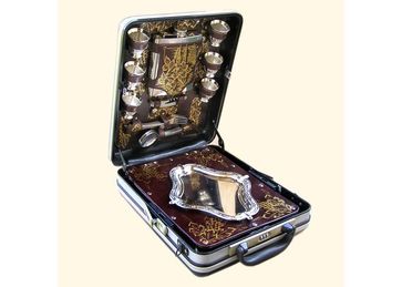 Набор подарочный «Оригинал» в темном оформлении (Набор для пикника)Комплектация:1. Кейс вертикальной компоновки с внутренней отделкой из натуральной кожи стойкой к загрязнениям, росписью ручной работы и откидным столиком 1шт.2. Фляжка из нержавеющей стали, отделанная натуральной кожей 0,5л   None