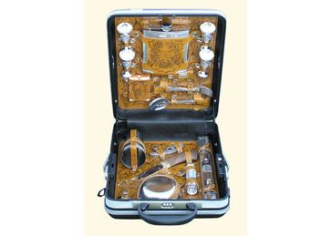 Набор подарочный «Стрелок» (Набор для пикника) Комплектация:1. Кейс пластиковый с внутренней отделкой из натуральной кожи и росписью ручной работы 1шт.2. Фляжка из нержавеющей стали 0,5 л 1шт.3. Вилки из нержавеющей стали &nb None