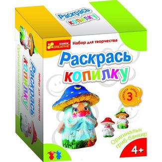 <p>В комплекте: керамическая копилка-грибочек, кисть беличья, спонжик, краски акриловые (5 цветов), блестки (3 цвета), стразы, звездочки, бумага цветная (4 цвета), клей ПВА, пошаговая инструкция.</p> <p>Рекомендовано для детей старше 4-х лет.<br /><br />Бренд: Ранок<br />Материал: керамика, бумага, краски<br />Размер: 15х18х8 см</p> Наличные, безнал., карты, эл. деньги, юр. лица Возможен самовывоз. Есть доставка.