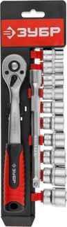 Набор ЗУБР "МАСТЕР": Торцовые головки (3 8") на пластиковом рельсе, трещотка, удлинитель, Cr-V, 10-19мм, 12 предметов
