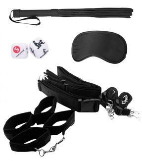 Набор для бондажа Bondage Belt Restraint System - набор, состоящий из 7 предметов для эротических ролевых игр и практик БДСМ. В комплекте: наручники, регулируемый ремень на талию и подматрасный ремешок, поножи, фиксаторы для кровати, маска, плеть, 2 игральных кубика. None