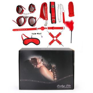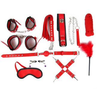 Великолепный набор аксессуаров для любителей БДСМ. В комплект входят наручники, оковы, ошейник с цепочкой-поводком, фиксатор, плеть, кляп, маска, верёвка, зажимы для сосков, щекоталка. Наручники, оковы, ошейник и маска снабжены специальной внутренней накладкой, предотвращающей натирание кожи. Также изделия имеют возможность регулирования размера. Зажимы для сосков украшены разноцветными бусинами, которые украсят грудь. Плеть-флоггер состоит из хвостов и удобной рукоятки с металлическими вставками и петлёй для подвешивания на крючок, щекоталка – из удобной ручки и пушистых перьев. Кляп оснащён шариком с отверстиями для дыхания.Набор упакован в большую коробку. Длина хвоста флоггера - 24 см., рукояти - 15 см. None