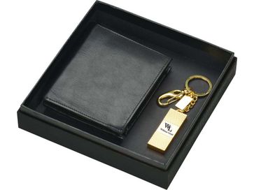 Набор оставляет впечатление роскоши и изыска благодаря сочетанию черного и золотистого оттенков. В набор входит портмоне из натуральной кожи с отделениями для банкнот, монет, визиток и флеш-карта памятью 8Гб. Тиснение (Блинт) на данный товар осуществляется бесплатно. Оплачивается только настройка оборудования в размере 3000 рублей на весь тираж. None