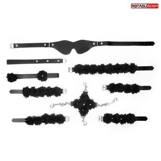 Великолепный набор аксессуаров для любителей БДСМ-игр. В комплект входят маска, фиксатор, ошейник с поводком, наручники, оковы, шлёпалка. Наручники, оковы, ошейник и маску можно регулировать по размеру. Изделия украшены декоративными цветами и оснащены качественной фурнитурой. В набор входит специальная сумка с ручкой-цепочкой для хранения интимных аксессуаров и презентабельная упаковочная коробка. В комплекте: маска, фиксатор, ошейник с поводком, наручники, оковы, шлёпалка.<br> Длина шлепалки - 25 см. None