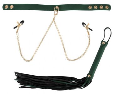 Зелёный комплект Fetish Set: ошейник, цепи с зажимами, плеть (244220)