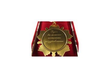 Текст надписи, которую вы хотите видеть на ордене, можно указать в графе "Адрес и дополнительная информация" при оформлении заказа через сайт или прислать нам по электронной почте на адрес info@dolina-podarkov.ruОтличный вариант как для подарка близкому человеку, так и в качестве КОРПОРАТИВНОГО подарка для коллег и партнеров по бизнесу.На оптовые закупки орденов (при стоимости заказа от 5 000 рублей) в этом сезоне действуют особенно выгодные условия.