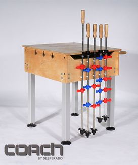 "Коуч", или тренер, - стол для тех, кто серьезно решил стать настоящим профессионалом в кикере! Эта модель создана для планомерной отработки технических приемов в условиях нехватки свободного места. Размеры стола составляют всего 75х75 см.! Возраст: Для взрослых Цвет: Светлое дерево Материал: Фанера Опоры: Металл Тип штанг: Сквозные 16 мм. Рукоятки: Дерево или ПВХ Мячей в комплекте: 2 шт. Габариты упаковки: (см.) Размер в собранном виде: 75х75х90(см.) Вес: 47 кг (кг.) Гарантия: 1 год Стол комплектуется 5-ю быстросъемными штангами, которые позволяют тренировать: пас на средней линии; удары по воротам с третьей линии. Стол изготовлен из влагостойкой фанеры 15 мм. и покрыт 2-мя слоями прозрачного лака. Стенка с воротами имеет 2 положения для более удобной тренировки паса. Скат для мячей выполнен на стороне атакующего для удобной тренировки в одиночку. Дополнительная рукоятка на корпусе для левой руки. "Сочный" звук при забитии мяча. Удобная крышка для корпуса делает возможным использование тренажера в качестве подставки, столика и в других домашних целях. Металлические ноги с регулировкой уровня. Удобные крепления для хранения штанг. None