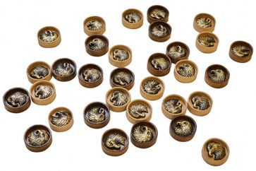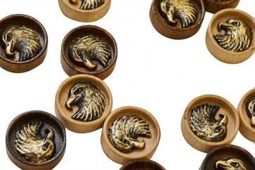 Фишки – неотъемлемый аксессуар для многих настольных игр, в частности – для нард и шашек. Комплект фишек «Орел» – это не просто игорный аксессуар, а настоящее произведение искусства. Выполненные из буковой древесины, они украшены резным изображением головы орла на каждой фишке. Каждое изображение, выполненное вручную, покрыто бронзовым напылением, которое добавляет изделию изысканности и благородства.