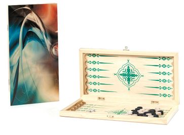 Верхняя крышка этого набора представляет собой великолепную картину, затягивающую ваше воображение в бесконечные глубины пространства. Яркие цвета, смелые абстракции подарят вам эстетическое удовольствие от обладания этим набором. Внутренняя поверхность доски светлого цвета со стандартной зеленой разметкой, 30 фишек и две кости. Набор имеет малые размеры, небольшой вес и непревзойденную оригинальность. Игра в нарды привлекает к себе внимание на протяжении веков, ее правила просты и доступны. Игра всегда станет прекрасным дополнением к дружескому общению.
