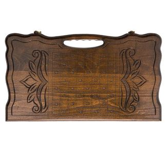 Резные нарды, выполненные известным мастером из Армении – Кареном Халеяном. Весь корпус выполнен вручную, что делает их уникальными и гарантирует максимально высокое качество исполнения. Это самый крупный размер из других представленных – длинная грань чуть больше 50 см. Мастер предусмотрел всё, поэтому здесь есть изысканно вырезанная ручка, которая позволит удобно их переносить. Сами нарды изготовлены из бука, что гарантирует их высокую прочность и очень долгий срок службы, а петли и крючки – из натуральной бронзы.