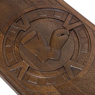На лицевой стороне вырезано изображение боксерских перчаток в узорном обрамлении. На задней створке имеется поле для игры в шашки, которое позволит расслабиться и отвлечься от напряженных партий. Внутренние стороны украшены солнцем в центральной части и мелким рифлением на каждой отдельной ячейке.