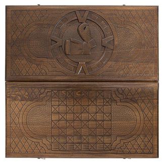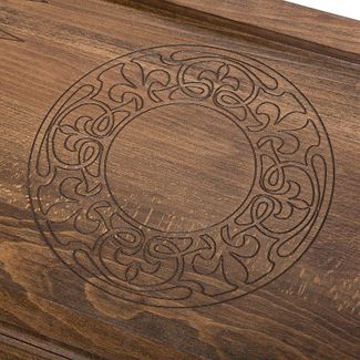 На лицевой стороне вырезано изображение боксерских перчаток в узорном обрамлении. На задней створке имеется поле для игры в шашки, которое позволит расслабиться и отвлечься от напряженных партий. Внутренние стороны украшены солнцем в центральной части и мелким рифлением на каждой отдельной ячейке.