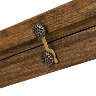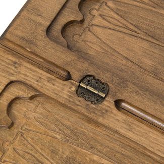 Внутренняя часть доски размечена под поле для нард. Здесь присутствует вся необходимая для этого разметка. Петли и замочный механизм выполнены из бронзы, что гарантирует долговечность и износостойкость набора даже при условии активной эксплуатации. Для удобства переноски и хранения набор упакован в качественный текстильный чехол.