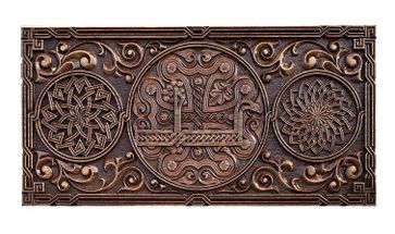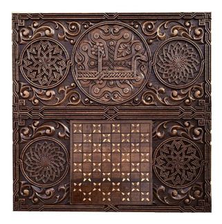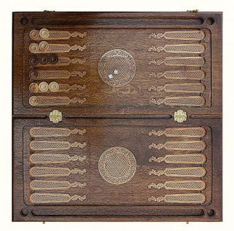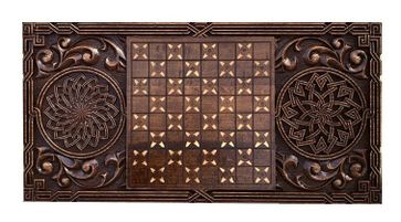 Доска, выполненная из натуральной древесины, поражает скрупулезной детализацией резного рисунка. Причудливые узоры гармонично сочетаются между собой, складываясь в единую композицию. Кроме поля для нард здесь также присутствует поле для игры в шашки. От царапин и потертостей доска защищена глянцевым лаком.
