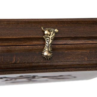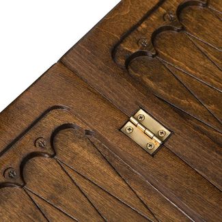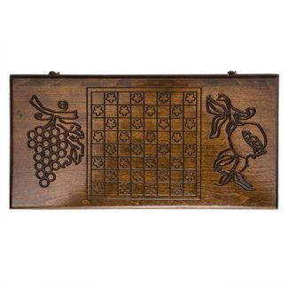 Сама доска изготовлена из прочной древесины, которая точно прослужит долгое время. Она покрывается слоем лака, который защищает от влажности и трещин, а дополнительно придает блеска. На внешней стороне вырезан красивый рисунок, причем – полностью ручным способом, с применением простейших инструментов. Для тех, кто любит игры попроще предусмотрено поле для шашек, в которые можно играть при помощи комплектных фишек. В комплекте также имеется чехол, который поможет обезопасить доску от налипания грязи во время переноса.