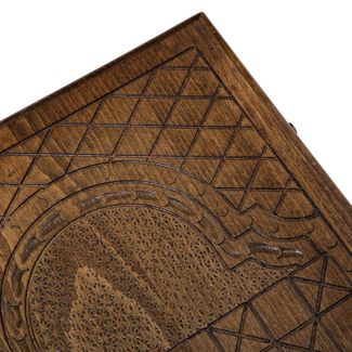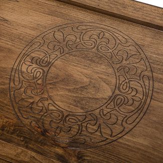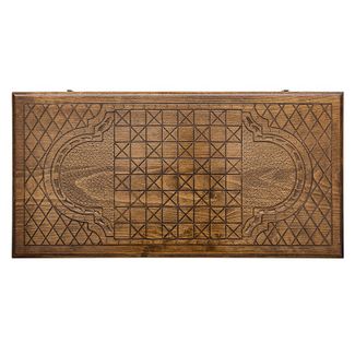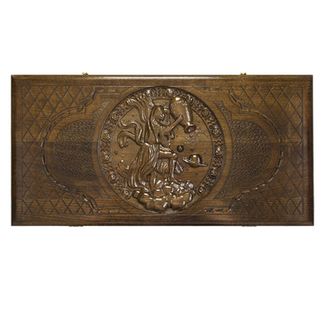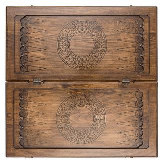 Лицевая сторона украшена изысканной резьбой, причем где-то используются геометрические фигуры, в других местах все округлое, а в третьих и вовсе теряешься в разнообразии. На обратной стороне имеется поле для игры в шашки, для чего можно использовать комплектные фишки. Они позволят расслабиться после напряженной партии в нарды. Изнутри створки украшены по центру круглым символически узором, а каждая отдельная ячейка дополнительно подчеркивается мелкими деталями.