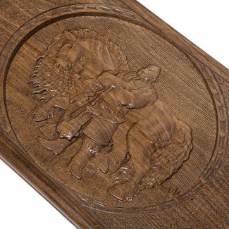 Григорий Устян получил свою популярность, благодаря многочисленным изделиям ручной работы, в каждом из которых присутствовала изюминка, а общее качество всегда сохранялось на самом высоком уровне. В этом экземпляре была затронута древнерусская тематика – богатырь Илья Муромец. Именно он изображен на лицевой части, где гордо стоит и глядит вдаль, на фоне своего огромного жеребца. Исходя из стоимости этого изделия, необходимо учитывать, что вы получаете ручную работу известного мастера, которой можно будет гордиться, а не просто использовать для игры.
