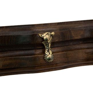 Для улучшения технических характеристик поверхность покрыта несколькими слоями лака, делающими ее более водоустойчивой. В качестве рисунка снаружи мастер выбрал изображение охотника и его собаки, стреляющими из засади по летящей птице. Изнутри же всё более просто – классические треугольные узоры около каждой ячейки. Петли и крючок для закрытия произведены из бронзы и можно быть уверенным, что даже после 1000 открываний будут работать как из коробки.