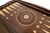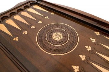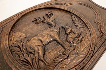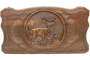 Крышка резной доски украшена изображением оленя. Это благородное животное подчеркивает статус изделия. На задней крышке нанесено поле для шашек. Внутренняя часть доски полностью отведена под стандартное нардовое поле с классическими узорами, украшающими его. Части доски скреплены надежными медными петлями.