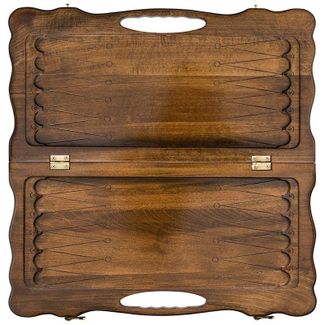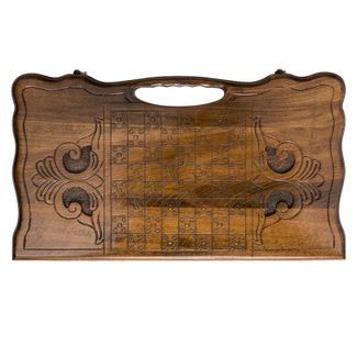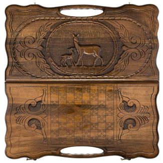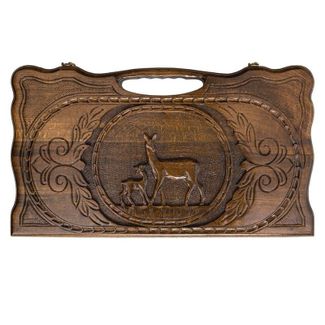 Также это достигается благодаря лакированному покрытию, которая защищает от влажности. Древесина обладает достаточной устойчивостью к деформации, поэтому даже при агрессивных партиях с ним ничего плохого не произойдет. Картина на доске Карен Халеян известен тем, что он украшает свои детища различными резными композициями. В этом случае была выбрана картина, где самка оленя гордо стоит рядом со своим малышом. Все это дополнительно украшено резкой, придающих целостности. На второй створке разлиновано поле, позволяющее играть в обычные шашки. Крючки из бронзы тоже не простые – прямо на металл нанесен узор, что придает им уникальности. Кстати петли также бронзовые и точно прослужат долго, независимо от того, насколько часто вы будете открывать и закрывать доску. None