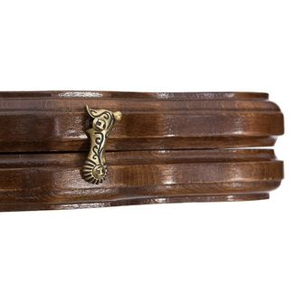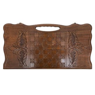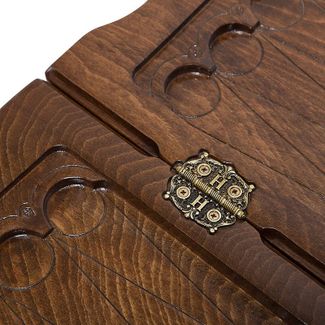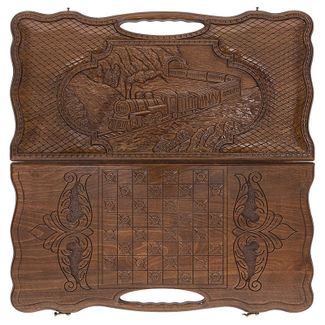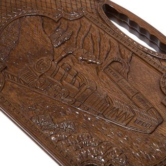 стороне вырезана ручка, оборудованная отверстиями для пальцев – она позволяет удобно брать рукой и переносить. Лицевая поверхность украшается изображением поезда, выезжающего из тоннеля, вырытого прямо в скале. Внутри узор наносится на каждую отдельную ячейку. Даже бронзовые петли выполнены нестандартно – необычная форма и эмблема производителя. Есть также специальное поле для игры в шашки, которое находится на обратной стороне доски.