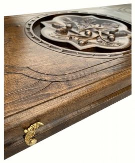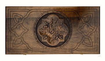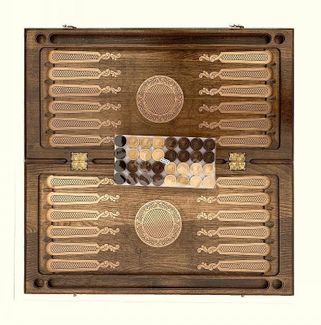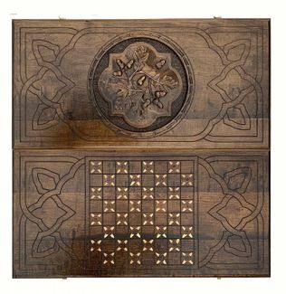 С внешней стороны доска украшена абстрактным узором с легко читаемыми растительными мотивами на одной стороне и полем для шашек – с другой. Внутренняя часть доски полностью отведена под нардовое поле. Медная фурнитура гарантирует устойчивость к износу и долговечность при частом использовании игрового набора.