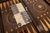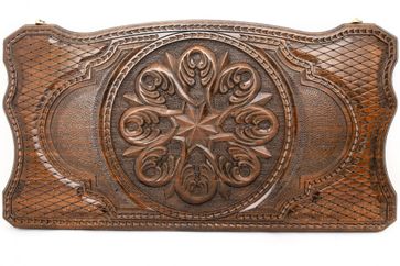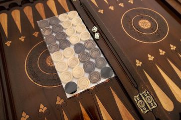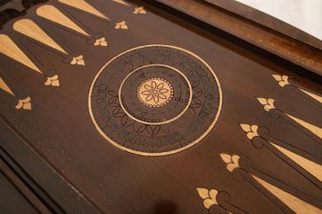 Верхняя крышка украшена византийскими символами, задняя – поле для шашек. Доска покрыта защитным глянцевым лаком и скреплена медной фурнитурой. Фишки стандартной формы хорошо лежат в руке. К каждой из них приклеена подложка, предотвращающая повреждение доски при игре.