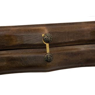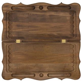 Внутренняя сторона доски сделана в виде игрового поля для нард со всеми соответствующими выемками и разметками. Доска складывается напополам благодаря качественным бронзовым петлям, а также надежно закрывается замочком, изготовленным из бронзы.