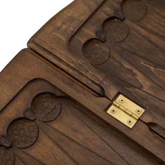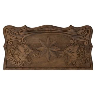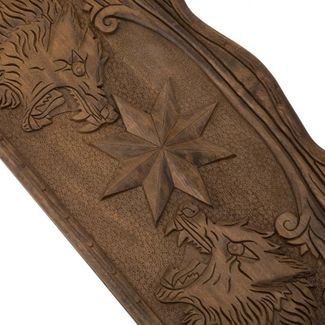 Сама доска не привычной, квадратной формы, а резная, с красивыми формами, напоминающими морскую волну. Внешняя поверхность створок украшена изображением звезды и ожесточенно смотрящих друг на друга волков. С другой – поле для игры в шашки, для чего можно будет использовать комплектные фишки. Внутри – каждая ячейка украшена собственным симметричным узором.