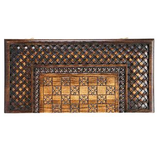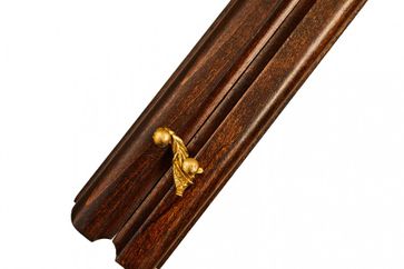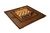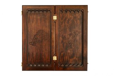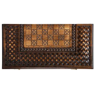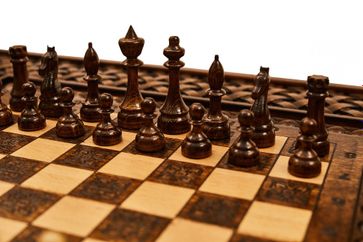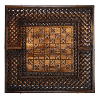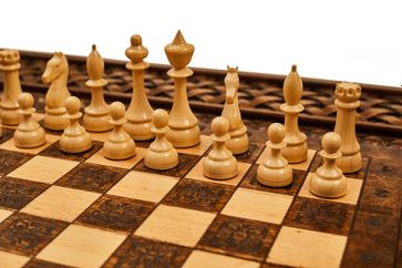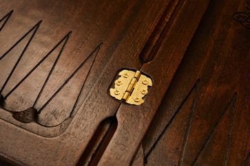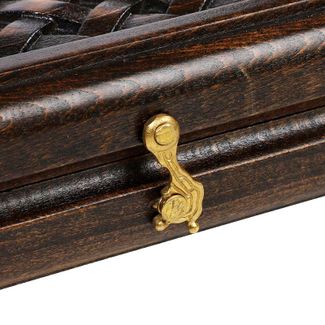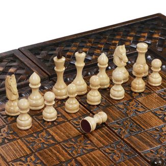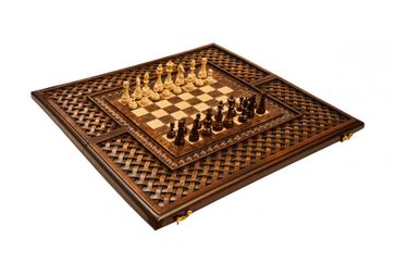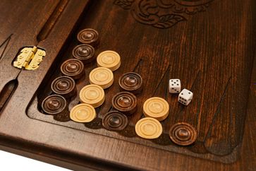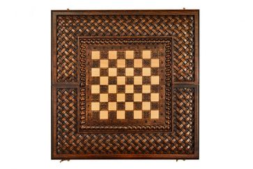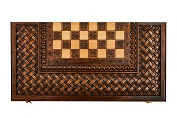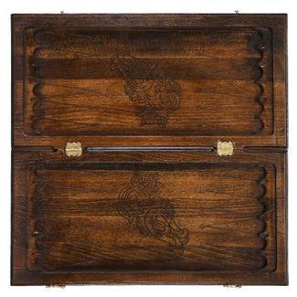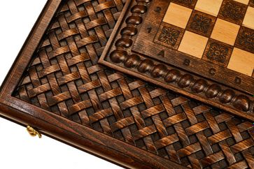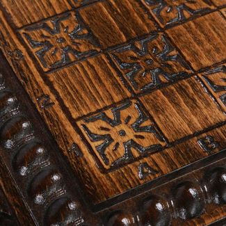 Фигуры выполнены в классическом стиле, а вот на доску стоит обратить особое внимание. Ее широкие поля, декорированные в технике резьбы, имеют невероятно приятную фактуру. Вся доска покрыта специализированным защитным лаком, обеспечивающим долговечность. Дополнительно износостойкость гарантирует высококачественная медная фурнитура. Обратную сторону доски занимает поле для нард.