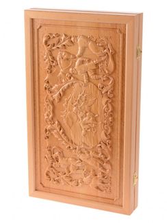 Доска украшена фактурной резной картиной «Соколиная охота», впечатляющей своей детализированностью. На обратной стороне доски, покрытой глянцевым защитным лаком, располагается поле для игры в шашки. Части доски скреплены между собой износостойкими петлями из настоящей меди.