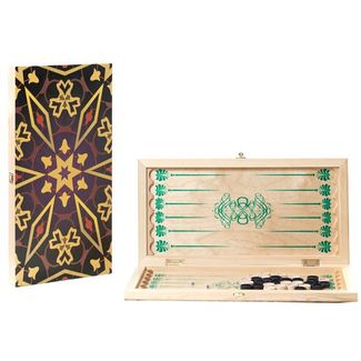 Популярная восточная игра нарды в оригинальном нарядном оформлении. Верхняя крышка игровой доски темного цвета покрыта роскошным орнаментом с преобладанием золотого и черного цветов. Причудливый орнамент складывается в шестигранную звезду. На внутреннюю часть игровой поверхности нанесена разметка зеленого цвета. В игровой набор входит 15 белых и 15 черных фишек, а также 2 игровых кости. Набор дает возможность играть как в короткие, так и в длинные нарды. Игра развивает интеллектуальные способности, формирует стратегическое мышление, повышает навыки устного счета. Имея с собой доску с игровым набором, всегда можно скрасить досуг и свободное время.