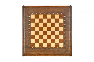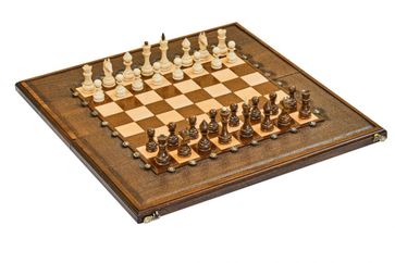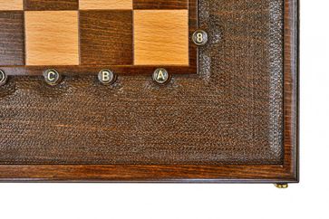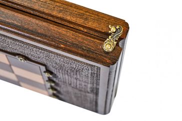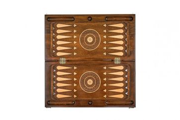 Доска украшена фактурными бортами и оригинальными узорами с внешней и внутренней стороны. Ее части скреплены между собой медными петлями. Каждый элемент набора покрыт тонким слоем глянцевого лака, защищающего их от износа. Появление царапин на доске предотвращают мягкие подложки, прикрепленные к каждой фигуре и фишке.
