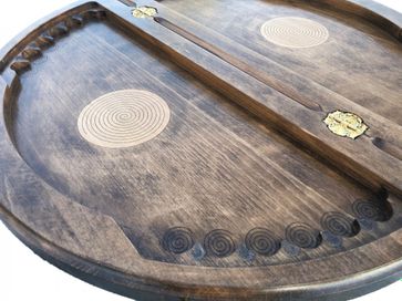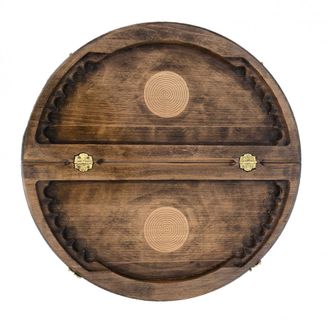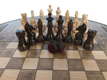 Комплект 3-в-1 шахматы, шашки и нарды «Круглые» – один из самых креативных наборов классических настольных игр во всем нашем ассортименте. Доска круглой формы оформлена в оригинальном дизайне, украшена резными узорами. На внешней стороне доски есть поле, которое подходит для шашек и шахмат, а внутренняя отведена под поле для нард. Выполнена она из натуральной буковой древесины. Это не просто игровой комплект, а настоящее произведение искусства, способное стать оригинальным украшением интерьера.