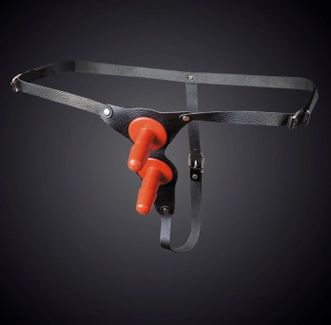 Страпон для двойного проникновения. В комплект входят два съёмных пластиковых плага для насадок. Изготовлен из натуральной кожи и никелированной фурнитуры. Размер универсальный. None