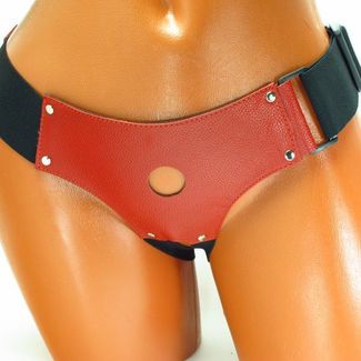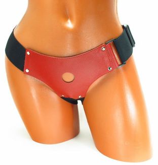 Трусики выполнены из натуральной кожи красного цвета с элементами из черных эластичных резинок, надежно фиксирующих изделие на теле. Трусики-джоки обеспечивают доступ к интимным зонам. Размер удобно регулируется, подойдет на 42-46. Максимально комфортный аксессуар разнообразит любую БДСМ игру. Ширина резинки на поясе - 5 см.<br> Диаметр отверстия для страпона - 2,5 см. None