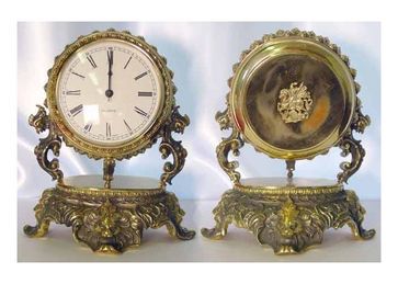 Современная авторская разработка. Стилизация в стиле ретро. Круглый корпус часов в обрамлении акантовых листьев установлен на овальном постаменте (плинт) с бронзовыми завитками и маскаронами. Корпус часов имеет две опоры в виде ренессансных завитков с петушиными головами. часы, часы каминные, часы настольные, часы настенные, напольные часы, бизнес сувениры, изделия из бронзы, дорогие подарки, подарки сувениры, часы кабинетные None