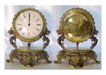 Современная авторская разработка. Стилизация в стиле ретро. Круглый корпус часов в обрамлении акантовых листьев установлен на овальном постаменте (плинт) с бронзовыми завитками и маскаронами. Корпус часов имеет две опоры в виде ренессансных завитков с петушиными головами. None