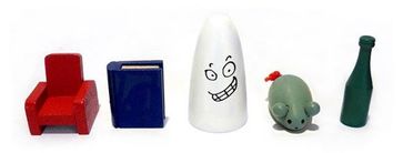 5 очень качественных деревянных фишек: Барабашка, бутылка, кресло, книга, мышь;