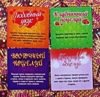 А вы можете похвастаться искусством поцелуев? Знаете ли вы, что есть такие виды поцелуев, как поцелуй «мурашки» или восточный? Игра «Сладкий поцелуй» поможет узнать много нового о них и поспособствует тренировке в искусстве поцелуя с любимым человеком! <br><br> И как же эта игра меня научит? Очень просто! Для начала разложите карточки рубашкой вверх в четыре ряда, затем переворачивайте по очереди две карточки. Если карточки совпали, заберите их себе, прочитайте вид поцелуя и инструкцию, а затем приступайте к тренировке с любимым человеком. Если карточки не совпали, тогда передайте ход второй половинке. Станьте профи поцелуев! None