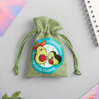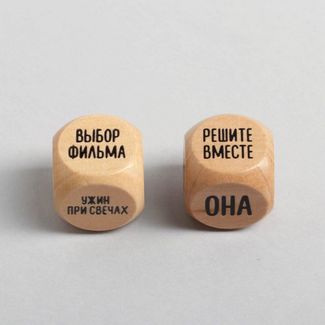 Два деревянных кубика в текстильном зеленом мешочке. На одном кубике обозначены варианты для свиданий (день в спа, просмотр фильма, ужин при свечах и пр.), а на втором кубике варианты кому выпадет организация этого мероприятия (либо вместе, либо он, либо она и пр.). None