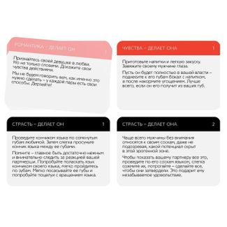 Возбуждающая игра для влюблённой пары. В этой игре собрано целых 60 рецептов наслаждения для вашей пары. Чего вы хотите сегодня? Нежности или страсти? Романтических признаний или решительных действий? Выбирайте, колоду какого цвета вы будете использовать, и познайте новые вершины удовольствия. Соблазн и страсть — вот что вас ждёт! В игре всего 3 колоды. Чем ярче колода, тем откровеннее в ней задания. Если ваша пара ещё только начала узнавать друг друга, то воспользуйтесь самой светлой колодой. Если у вас уже была близость, подключите следующие колоды, постепенно делая задания всё горячее. На одной стороне карточки указаны действия для девушки, а на другой — для мужчины. Ознакомьтесь с информацией на обеих сторонах выбранной карты и дерзайте. Внутри вы найдёте 30 карточек и правила игры. Приготовьтесь узнать друг друга с новой стороны! В комплекте: 30 карточек, правила игры. None