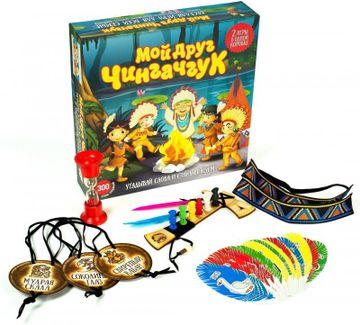 Состав: 150 двусторонних карточек-перьев 6 разноцветных фишек игроков 6 индейских повязок 8 амулетов персонажей 1 магический томагавк 1 песочные часы правила игры None